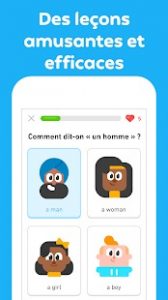 • C’est amusant. Perds des cœurs en répondant de façon incorrecte, avance en terminant de petites leçons, et obtiens des points pour monter au niveau supérieur.