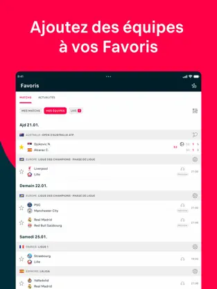 2. Suivi personnalisé : Ajoutez vos équipes, compétitions et joueurs préférés pour un accès rapide.