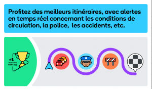 Dans la liste de guidage, on visualise toutes les allées éligibles, les signalements, les risques et les obstacles que l’on peut trouver tout au long du chemin, (comme les travaux de maçonnerie ou les véhicules en panne), ou encore les phénomènes de la météo: s’il y a du brouillard ou de la grêle, s’il y a une tempête de verglas, des inondations ou des routes enneigées.